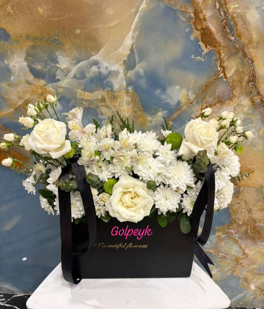 باکس گل تسلیت ترکیب گلها شامل رز آلستر داودی و اکالیپتوس